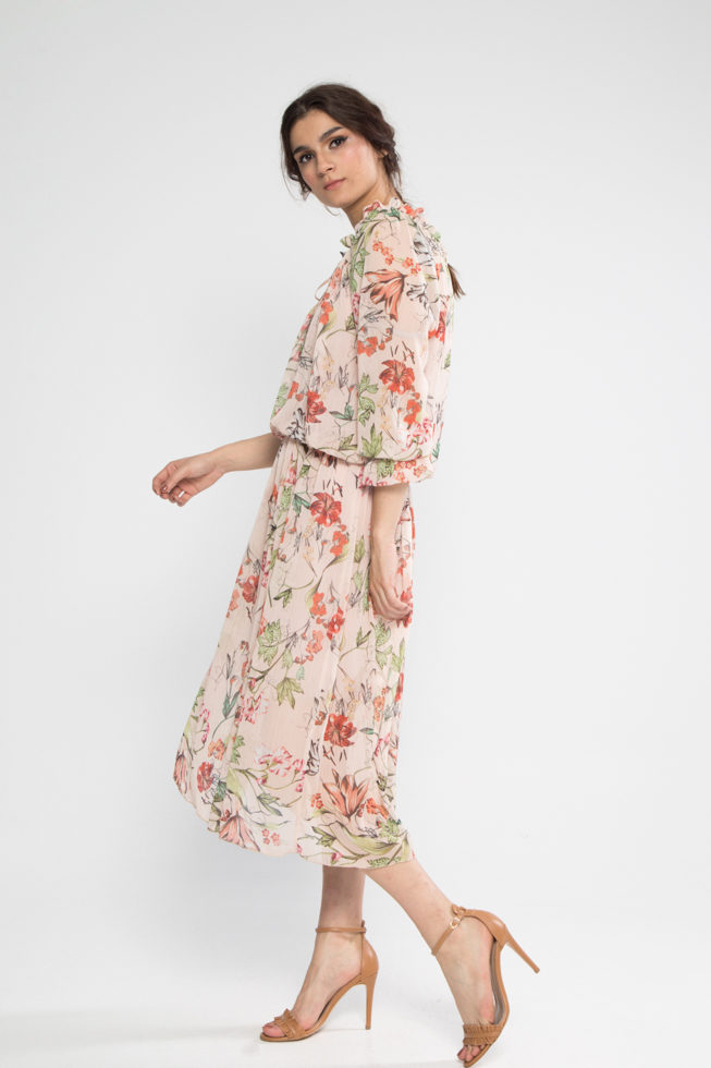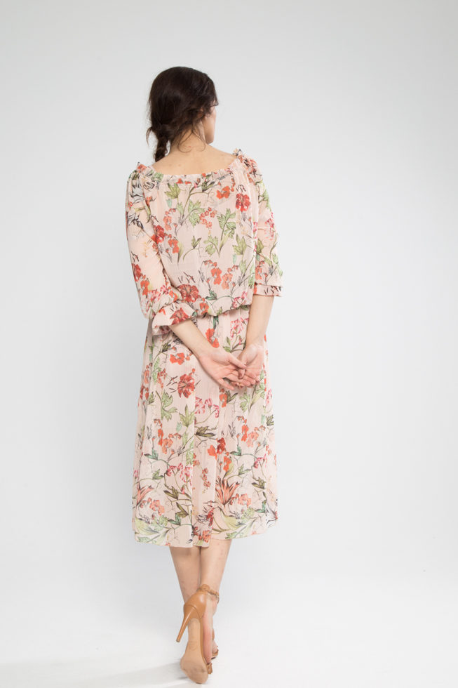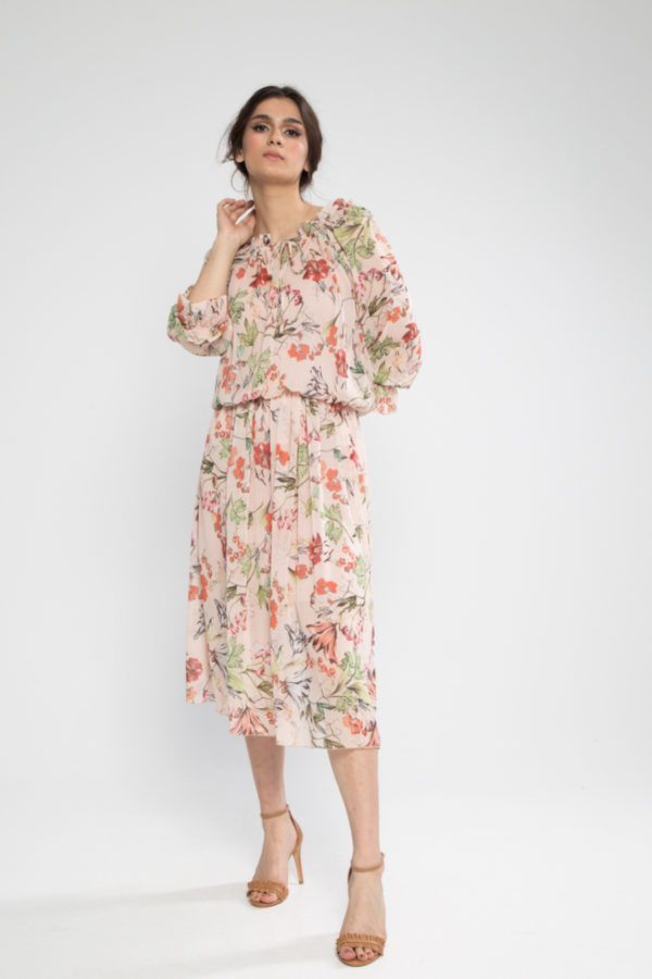 Φόρεμα ζορζέτα μανίκι βολάν και λάστιχο στη μέση